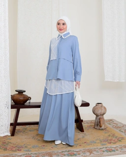Features: Atasan Kemeja Kancing depan (busui friendly). Lengan wudhu friendly. Pinggang Rok Full Karet.